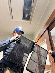 お店に設置されているグリスフィルターを回収・洗浄しています